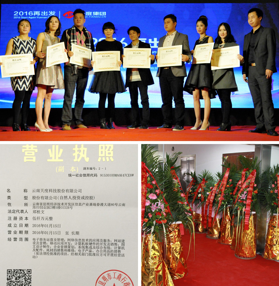 2016年1月28日,云南天度集團(tuán)董事長(zhǎng)鄭桂文向所有獲得股份獎(jiǎng)勵(lì)的員工頒發(fā)了《股權(quán)證書》,并將所有股東、董事、監(jiān)事提交到云南省工商行政管理局進(jìn)行了正式登記。