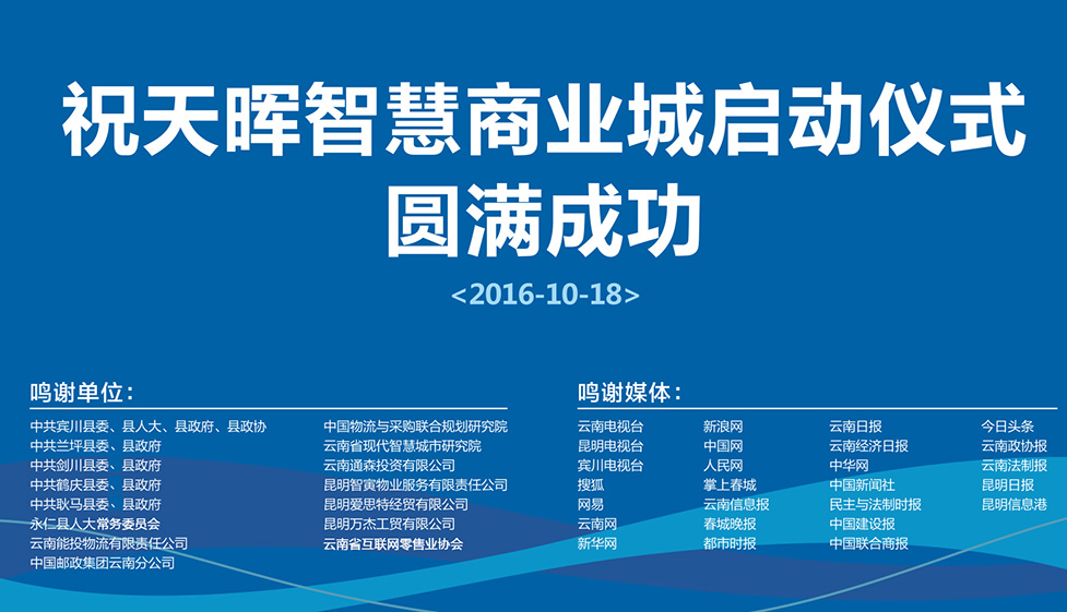 2016年10月18日,由云南天暉投資有限公司、云南天度投資集團(tuán)有限公司和云南天暉城經(jīng)營(yíng)管理有限公司聯(lián)合推出的“天暉智慧商業(yè)城”在大理賓川正式啟動(dòng)。2017年1月19日,天暉城O2O眾創(chuàng)空間落戶賓川,大理州委常委、賓川縣委岳黎松書記、縣政府楊澤亮縣長(zhǎng)、縣人大張成良主任、縣政協(xié)文慧君主席等相關(guān)領(lǐng)導(dǎo)及縣各部委辦局負(fù)責(zé)人參加了本次活動(dòng)。