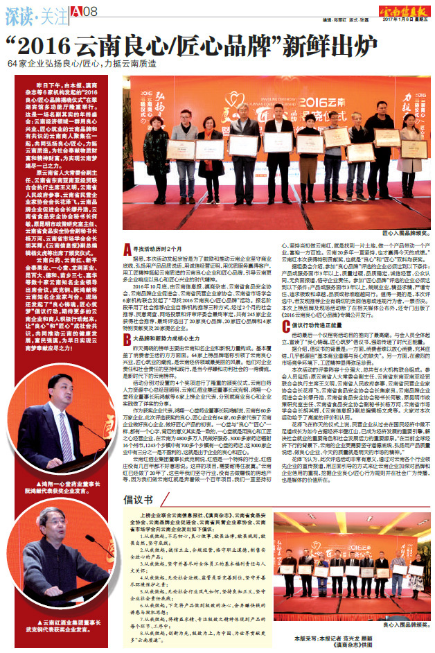 昨日下午,由云南信息報、滇商雜志、云南省民營企業(yè)家協(xié)會、云南省食品協(xié)會等6家機構(gòu)發(fā)起的“2016良心/匠心品牌揭曉儀式”在翠湖賓館多功能廳隆重舉行。這是一場名副其實的年終盛會:云南經(jīng)濟領域一群用良心興業(yè)、匠心筑業(yè)的云南品牌和有共識的云南商人聚集在一起,共同弘揚良心/匠心,力挺云南質(zhì)造,為社會奉獻物質(zhì)財富和精神財富,為實現(xiàn)云南夢竭盡一己之力。