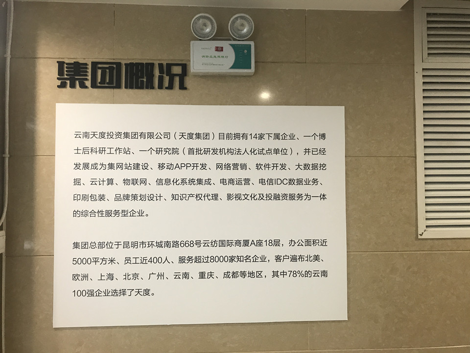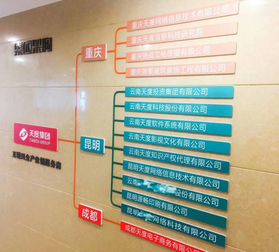 集團(tuán)概況的文化墻對面就是咱們天度更詳細(xì)的“集團(tuán)架構(gòu)”,分別羅列出了重慶、昆明、成都三個總部的子公司,讓客戶對天度集團(tuán)名下的子公司有更深入的認(rèn)識,也從正面證明了天度12年積累下來的傲人的成果。