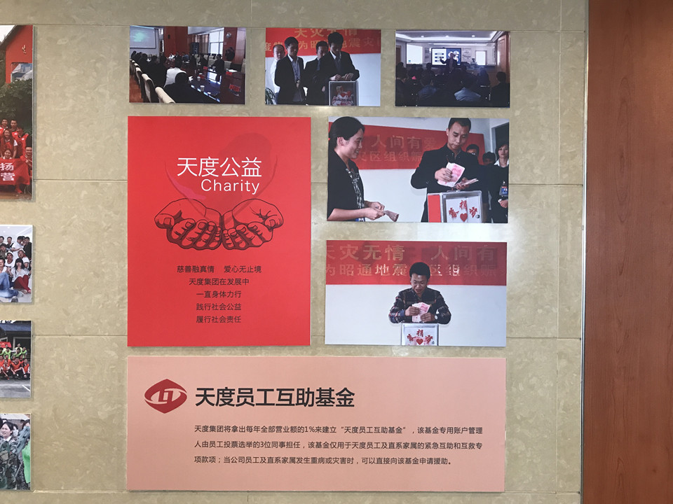 每一分榮譽(yù)證書的背后,都離不開為集團(tuán)默默付出的員工。天度集團(tuán)也珍視每一位員工,特別在集團(tuán)內(nèi)部設(shè)立“天度公益”,一個只屬于天度員工的互助基金,賬戶管理由全體員工投票選出三位同事?lián)?,?dāng)公司員工及家屬發(fā)生重病或?yàn)?zāi)害時,可以直接向該基金申請救助!