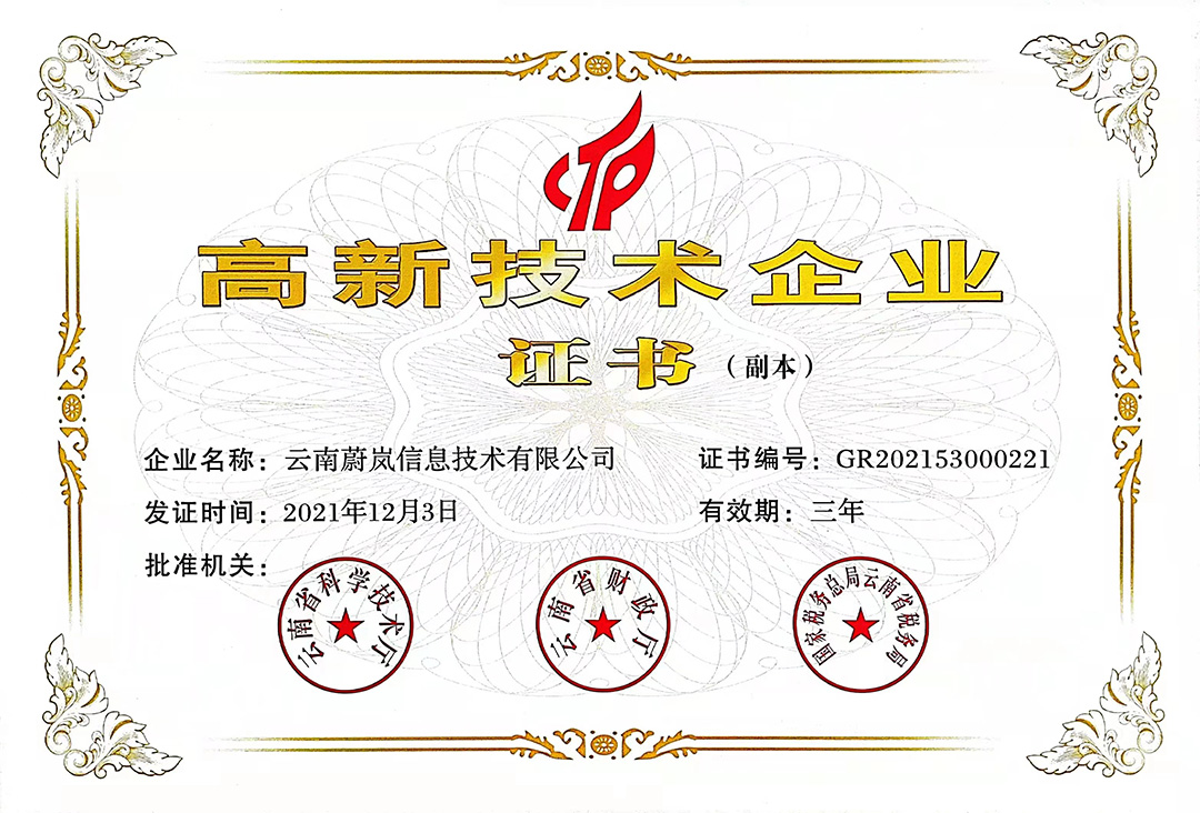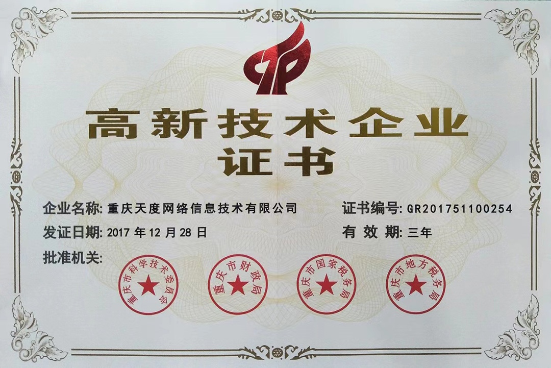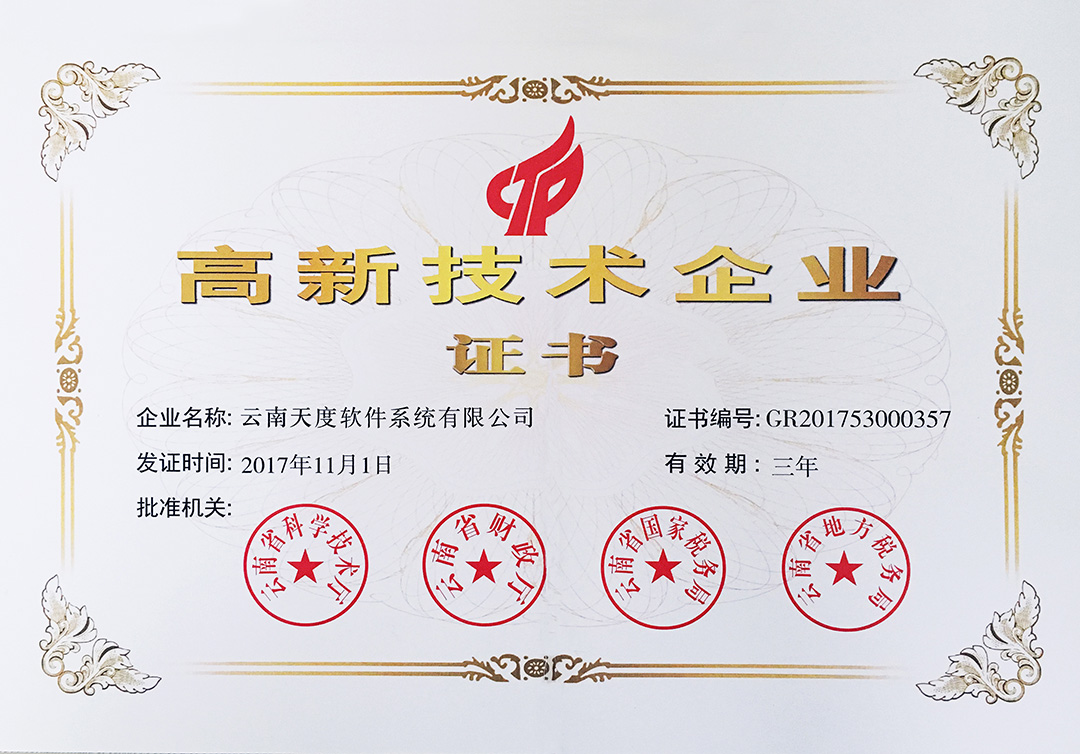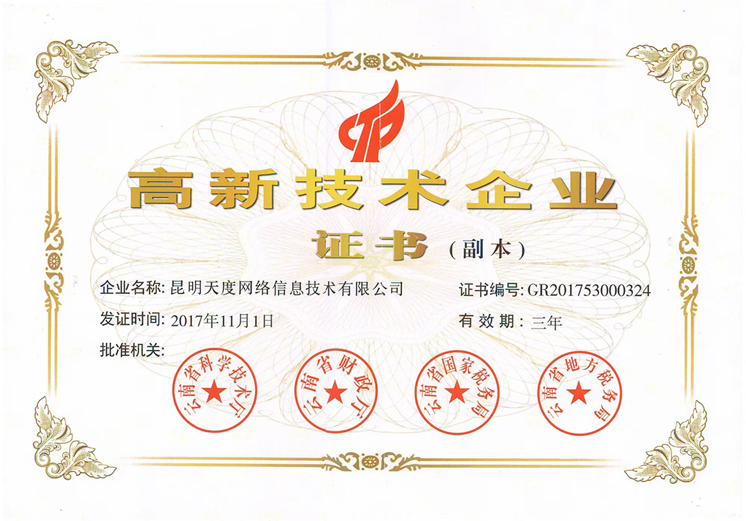 云南天度集團旗下云南蔚嵐信息技術(shù)有限公司、云南天度科技股份有限公司、云南天度軟件系統(tǒng)有限公司、昆明天度網(wǎng)絡(luò)信息技術(shù)有限公司、重慶天度網(wǎng)絡(luò)信息技術(shù)有限公司等5家企業(yè)獲得國家高新技術(shù)企業(yè)認定。