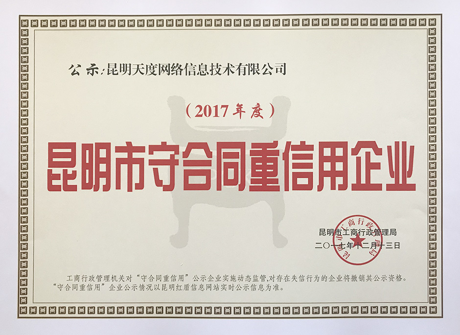 經(jīng)昆明市人民政府“守合同重信用”領(lǐng)導小組辦公室(昆明市工商行政管理局)組織推薦、昆明市人民政府“守合同重信用”領(lǐng)導小組成員單位聯(lián)合審查和通過媒體公示接受社會各界監(jiān)督等工作程序,已完成公示認定工作。熱烈祝賀昆明天度網(wǎng)絡(luò)信息技術(shù)有限公司被昆明市工商行政管理局評為2017年度“昆明市守合同重信用企業(yè)”。