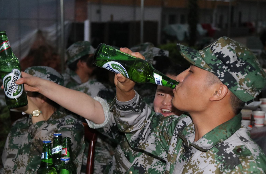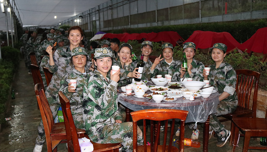 下午訓(xùn)練結(jié)束集合的時(shí)候,教官突然宣布說晚上有聚餐,大家頓時(shí)像炸開鍋一樣的,畢竟我們這兩天吃盒飯吃得眼睛都要冒綠光了,能在這么艱苦的時(shí)候有一桌大肉吃,真的讓大家有一種撿到錢的幸福感。晚餐的氣氛異?;钴S,行政部妹紙們也貼心地給大家準(zhǔn)備了酒水助興。