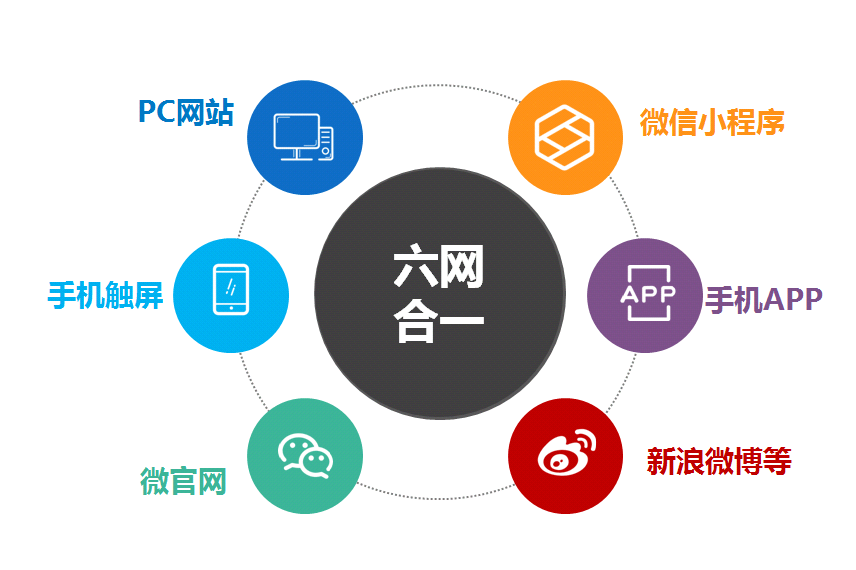 入口為六網(wǎng)合一(PC版、觸屏版WAP、微信版、微博信息推送、手機(jī)APP、一個主后臺),