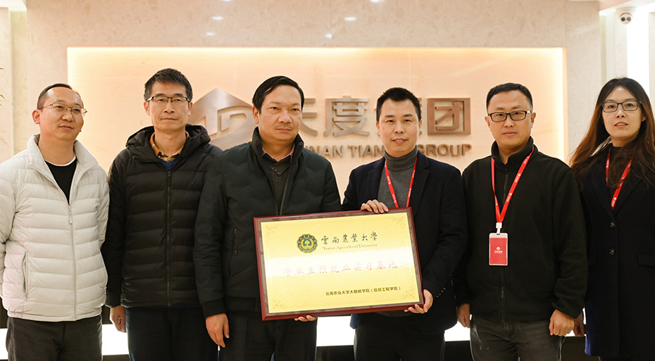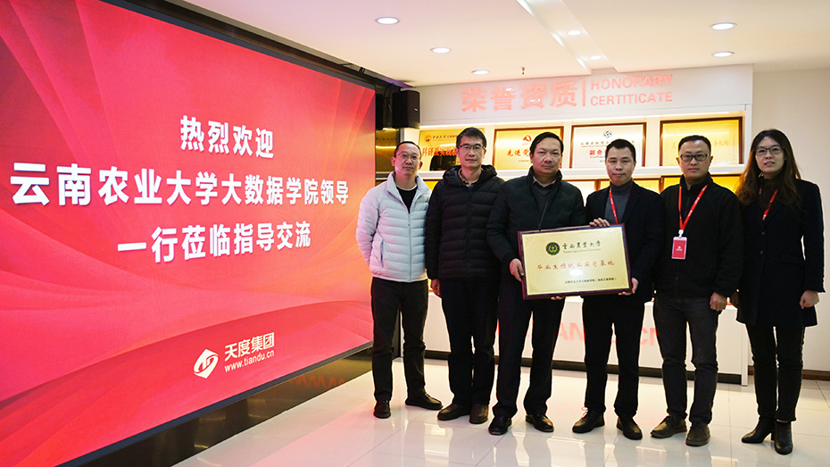 云南農(nóng)業(yè)大學煙草學院黨委書記李作森,大數(shù)據(jù)學院(信息工程學院)黨委書記王燦宇,副院長楊建平,副書記趙紅波等領導一行到天度集團總部指導交流,雙方就校企合作、就業(yè)實習等領域合作達成意向并現(xiàn)場簽署《合作協(xié)議》,云南農(nóng)業(yè)大學大數(shù)據(jù)學院向天度集團進行“畢業(yè)生預就業(yè)實習基地”授牌。