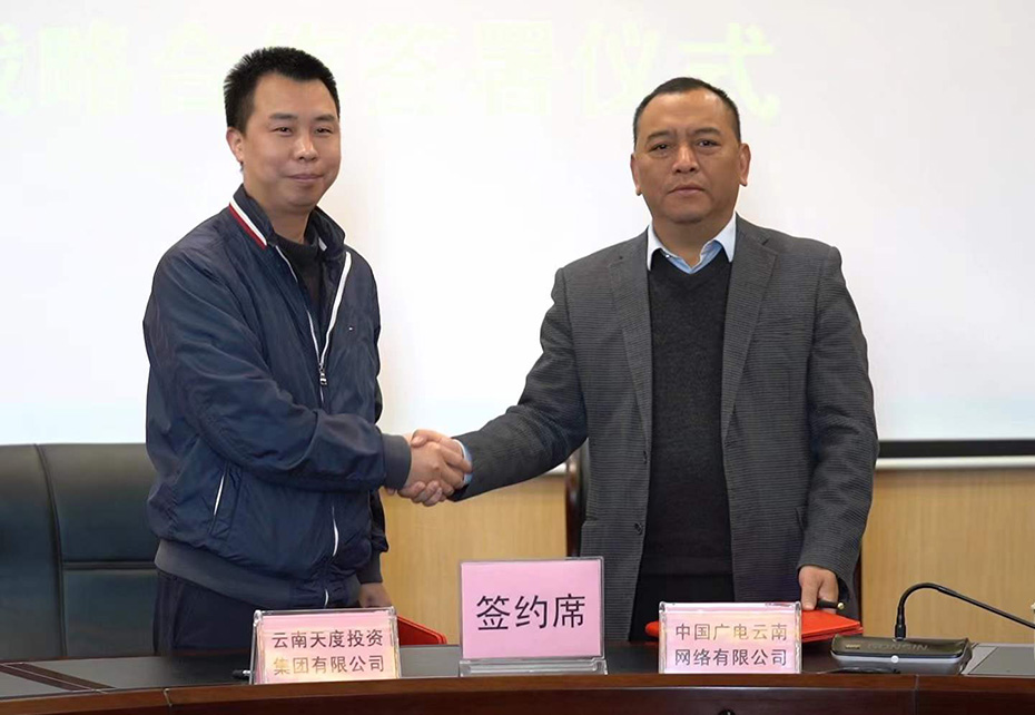 2月17日上午,中國廣電云南網(wǎng)絡有限公司與云南天度投資集團有限公司《戰(zhàn)略合作協(xié)議》簽署儀式在中國廣電云南網(wǎng)絡有限公司總部A座19樓舉行,雙方將在“文化固邊、電商興邊”、數(shù)字化服務及直播電商等新業(yè)態(tài)、新領(lǐng)域展開全面深入合作。中國廣電云南網(wǎng)絡有限公司總經(jīng)理趙聯(lián)濤,云南天度投資集團有限公司董事長鄭桂文分別代表雙方簽署協(xié)議。
