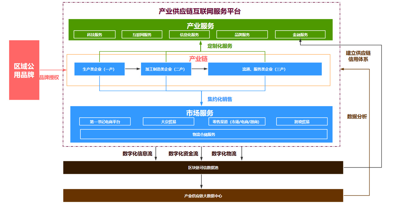 數(shù)字化供應(yīng)鏈服務(wù)平臺應(yīng)立足區(qū)域傳統(tǒng)產(chǎn)業(yè)、優(yōu)勢產(chǎn)業(yè)及重點支柱產(chǎn)業(yè),將電子商務(wù)將與發(fā)展需求充分結(jié)合,建立線上線下一體化的服務(wù)體系。平臺將區(qū)域品牌化體系建設(shè)為產(chǎn)業(yè)標準入口,服務(wù)于供應(yīng)鏈內(nèi)各企業(yè)主體,貫穿產(chǎn)業(yè)鏈從生產(chǎn)端、加工制造端、流通端全鏈條,以提升供應(yīng)鏈各主體協(xié)同效率。同時,平臺以數(shù)字化為核心手段及時獲取供應(yīng)鏈信息流、物流、資金流等數(shù)據(jù),并基于區(qū)塊鏈技術(shù)建立一套產(chǎn)業(yè)可信數(shù)據(jù)池,應(yīng)用大數(shù)據(jù)分析技術(shù)對供應(yīng)鏈進行動態(tài)分析,最終實現(xiàn)智慧化供應(yīng)鏈系統(tǒng),成為基于數(shù)字化供應(yīng)鏈的集約化、智能化、創(chuàng)新性的開放式產(chǎn)業(yè)生態(tài)平臺,以市場化、數(shù)據(jù)化、智慧化的運營方式促進產(chǎn)業(yè)升級,創(chuàng)造價值與財富。